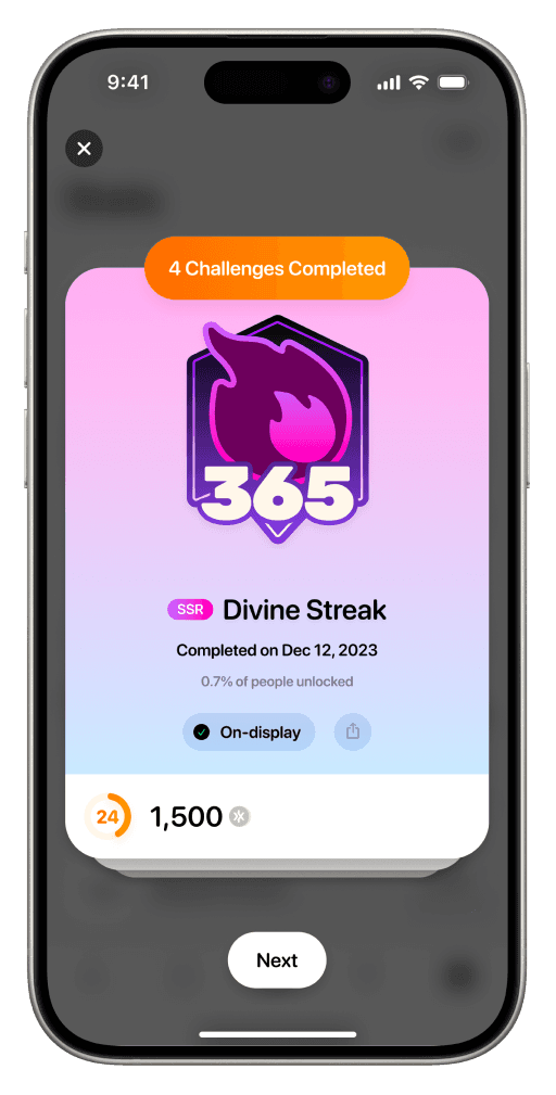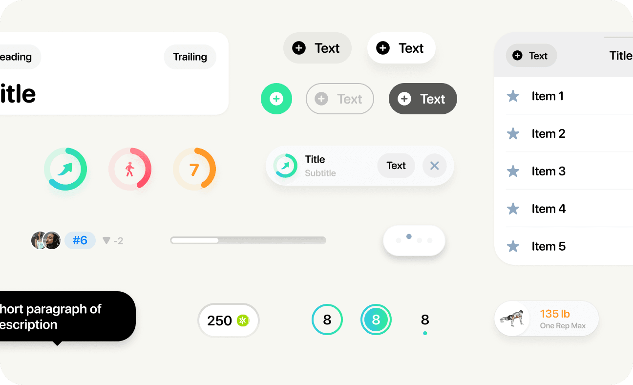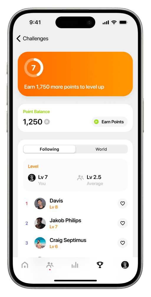 To encourage and reward long-term progress, gamification was a key design strategy. Elements like achievements, points, and leaderboards were integrated to make progress feel more tangible. However, since gaming elements can be overwhelming in a fitness app, I focused on striking the right balance between maintaining a low cognitive load and promoting high engagement. The gamification features were designed with the same delightful aesthetic, emphasizing approachability and consistency, while also incorporating playful touches in subtle details like interactivity and graphic design.
